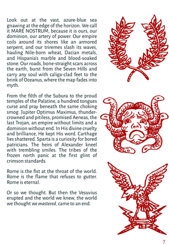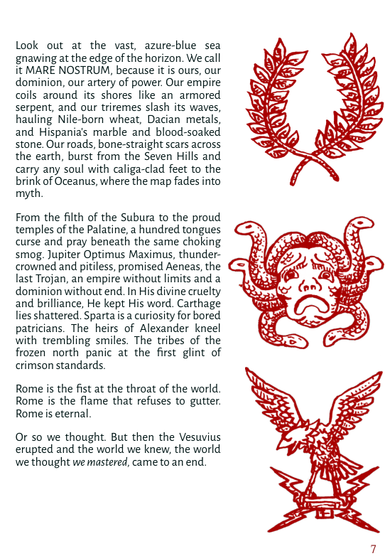 CASTRVM is a soon-to-be-released tabletop role-playing game set in an even darker and deadlier version of Ancient Rome, designed as a hack of the acclaimed Mörk Borg system and using the Mörk Borg Third Party Game License. This game plunges players into a gritty, high-stakes environment where survival is uncertain and death is a constant companion.